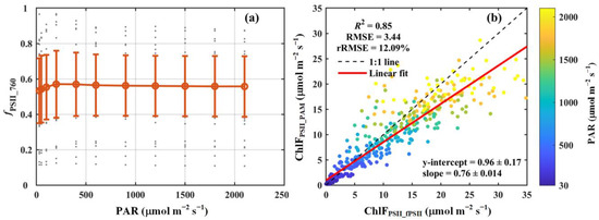(a) The light response curve of the contribution of PSII to total chlorophyll fluorescence at 760 nm (fPSII_760). (b) Comparison of the broadband chlorophyll fluorescence from PSII estimated using fPSII_760 (ChlFPSII_fPSII) with that derived from PAM measurements (ChlFPSII_PAM). The red circles and error bars in panel (a) denote the means and standard deviations for 52 species, respectively, while the gray dots show the results for each species. In panel (b), the black dashed line and red solid line indicate the 1:1 line and the linear regression result, respectively. The color scheme indicates photosynthetically active radiation (PAR, μmol m−2 s−1). The coefficient of determination (R2), root-mean-square error (RMSE, μmol m−2 s−1), and relative root-mean-square error (rRMSE, %) are reported. The regression slope and intercept are also included.
