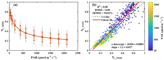 The modeled qL (qL_MOD), using the method proposed by Liu et al. [22], is presented in Figure 5. Similarly to qL_PAM, qL_MOD exhibits a strong response to variations in light intensity, decreasing sharply under low light conditions and stabilizing as light intensity increases (Figure 5a). A modest underestimation of qL_MOD was observed under low light conditions, possibly due to the absence of low-light measurements in the dataset used to fit the empirical parameters. Despite this underestimation, qL_MOD accounted for 90% of the variation in qL_PAM, with an RMSE and rRMSE of 0.09 and 10.01%, respectively (Figure 5b). These results suggest that the fitted empirical parameters (Table S1) provide a robust framework for modeling qL across a wide range of environmental conditions.