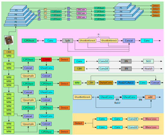 To address the limitations of traditional networks in accurately identifying small defects on guide rail pressure plates, along with their high computational cost, this paper proposes the LGR-Net detection algorithm (as shown in Figure 3). The LGR-Net network is built upon the YOLOv8n baseline model and incorporates several improvements. The backbone network, being a critical component for feature extraction, initially has a high parameter count. To address this issue, this study designs a lightweight backbone network based on MobileNetV3, reducing the parameter count by approximately 20% compared to the original network. Furthermore, the Ghost convolution module and a newly designed C2fGhost module are introduced to optimize the neck network, reducing the parameter count by an additional 4%. Finally, to enhance the algorithm’s ability to detect small defects, a small object detection layer is added, and a four-scale feature fusion network is constructed. Additionally, the CBAM is incorporated to improve the model’s focus on small defect detection.