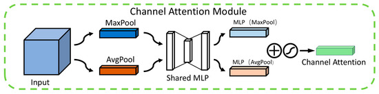 The primary role of the channel attention module (CAM) is to assign weights to each channel within the feature map, amplifying those linked to minor defects while diminishing the influence of unrelated channels. As depicted in Figure 5, the CAM operates through a series of structured steps. Initially, in the feature extraction stage, it utilizes both average pooling and max pooling techniques to gather comprehensive information across each channel. Average pooling is instrumental in mapping the general spread of defects, whereas max pooling accentuates the distinctive local characteristics of these defects. Subsequently, during the channel weight computation phase, the outcomes from both pooling methods are channeled into a shared multilayer perceptron (MLP). This MLP intelligently recalibrates the channel weights in response to the nuanced edge variations of the defects, thereby facilitating a dynamic refinement of the feature map. In the concluding feature map weighting phase, the computed channel weights are integrated with the original feature map through multiplication, thereby elevating the visibility of minor defects within the map. This adaptive mechanism empowers the CAM to direct the model’s attention more effectively towards the pivotal features indicative of defects.