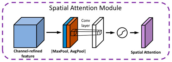 The spatial attention module (SAM) dynamically modulates the weight assigned to each spatial position within the feature map, thereby enabling the model to accurately pinpoint defects. Illustrated in Figure 6, the SAM’s architecture begins by consolidating spatial information through average pooling and max pooling operations applied across the channel dimension, resulting in the creation of two distinct 2D feature maps. These maps are then concatenated and fed into a convolutional layer, which synthesizes a spatial weight map. This map is subsequently normalized to a [0, 1] range via a sigmoid function. In the final step, the SAM integrates this spatial weight map with the original feature map through multiplication, effectively enabling the network to diminish the significance of non-critical areas while accentuating regions of importance. This mechanism is particularly effective when analyzing guide rail clamp imagery, as the SAM allocates greater emphasis to minuscule hole defects—spanning just a few pixels—by assigning them higher weights within the spatial weight map. This not only amplifies the characteristics of defect-laden regions but also facilitates the model’s ability to precisely identify the locations of these defects.