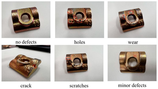 Since no publicly accessible datasets for guide rail clamps are available, this study relied on a custom-built dataset for experimentation, consisting of 1000 images captured from multiple angles and positions of guide rail clamps. As depicted in Figure 9, the dataset encompasses a variety of defects, including pitting holes, cracks, scratches, and wear. The data annotation process was carried out using the open-source labeling tool LabelImg. Five distinct labels were established for annotation: W represents the guide rail clamp body, d denotes pitting hole defects, c indicates crack defects, s signifies scratch defects, and w represents wear defects.