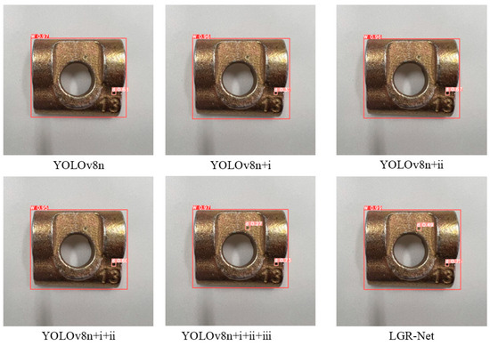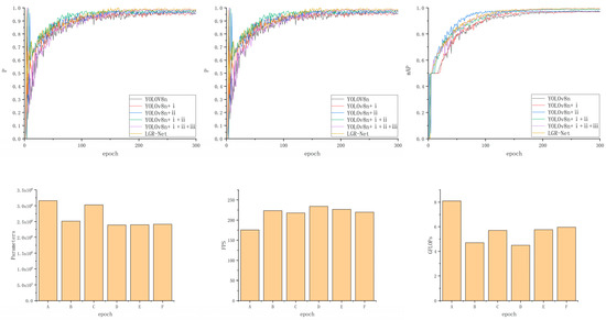 Visualization of ablation experiment data. ((A)—YOLOv8n, (B)—YOLOv8n + i, (C)—YOLOv8n + ii, (D)—YOLOv8n + i + ii, (E)—YOLOv8n + i +ii + iii, (F)—LGR-Net).