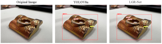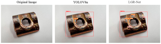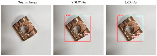 Figure 14 demonstrates the model’s effectiveness in detecting hole defects, where LGR-Net identified tiny defects that YOLOv8 failed to detect, further validating the efficacy of the added P2 detection layer for small defects. Figure 15 and Figure 16 illustrate the model’s performance in detecting scratch and crack defects, respectively. Compared to YOLOv8, LGR-Net provided more accurate localization of these defects, highlighting the role of the CBAM in achieving precise defect localization. Figure 17 showcases the model’s ability to detect wear defects. Unlike other defects, wear defects exhibit less distinct features, making them challenging for YOLOv8 to identify. However, LGR-Net, leveraging the CBAM, accurately detected these defects. The visualization results clearly demonstrate the superior detection performance of the proposed LGR-Net network. Compared to the YOLOv8 algorithm, LGR-Net identified more defects with higher accuracy, provided more precise localization, and achieved significantly higher confidence levels in detection boxes. These visual results robustly validate the feasibility of the proposed LGR-Net model.