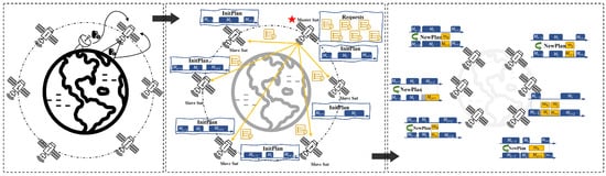 The essence of satellite observation scheduling lies in matching tasks to satellites and determining the precise observation time for each task [3]. Most existing studies focus on static scheduling scenarios, where all observation tasks are assumed to be predefined at once, and the scheduling results remain fixed throughout the process [4]. The diverse demands for Earth observation and the complexity of observation tasks have led to the need for efficient satellite scheduling [5]. Most current studies focus on static scheduling scenarios, where all observation tasks are assumed to be deterministic and remain fixed throughout the scheduling process. However, in real-world satellite mission planning scenarios, there are both internal uncertainties (e.g., partial satellite equipment failures) and external uncertainties (e.g., changes in observation opportunities or user demand), which make the planning process highly dynamic [6]. These factors lead to the episodic and unpredictable nature of observation requests, highlighting the need for continuous adjustment and adaptation of mission replanning in response to unexpected emergencies [7].