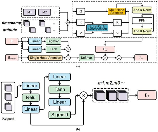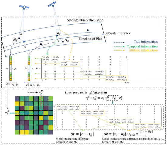 Inspired by the multilevel temporal information rotational position encoding method in [63], we embed the timestamp information from the original missions and the side swing angles for request–satellite pairs, modeling the temporal correlations between mission sequence. By incorporating temporal and attitude information, we enhance the attention mechanism to explicitly capture the absolute timing information of the tasks and calculate the relative transition span between tasks. Figure 3 illustrates the schematic diagram of the embedding process.