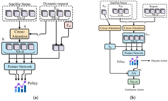 The sequence-to-sequence (seq2seq) model is an advanced combinatorial optimization framework that provides an encode-decode strategy learning paradigm. Pointer networks (Ptr-Net) [57] and Transformer architectures [58] have been proven effective in solving problems like the vehicle routing problem (VRP) and traveling salesman problem (TSP). Liu et al. [59] proposed a model with a local attention mechanism to reduce the search space in the autoregressive process, improving decision quality. Chen et al. [60] used attention layers to model dynamic time dependencies between satellite tasks, training an encoder–decoder neural network with the REINFORCE algorithm. Li et al. [14] used a trained pointer network to generate single EOS scheduling solutions in an end-to-end manner for rapid onboard replanning. Liang et al. [61] implemented rapid rescheduling using an improved pointer network with a masking mechanism to maximize the completion profit of dynamic tasks while minimizing the impact on scheduled tasks. Long et al. [62] proposed a scalable task planning method based on a Transformer model with time encoding, which we consider as one of the baselines in this study.