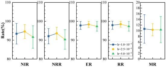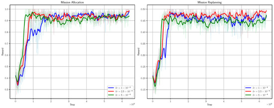 We trained the model with PPO learning rates of 1 × 10−4, 2.5 × 10−4, and 5 × 10−4, with the training curves shown in Figure 5. The convergence speed is slower with a smaller learning rate, and faster with a larger one. As seen in Figure 12, the models with learning rates of 1 × 10−4 and 2.5 × 10−4 perform similarly, while the model with lr = 5 × 10−4 shows a slight drop in performance as the task scale increases. The model with lr = 2.5 × 10−4 also has the smallest standard deviation across metrics in different scenarios, indicating better strategy adaptation. Therefore, we chose 2.5 × 10−4 as our optimal learning rate.