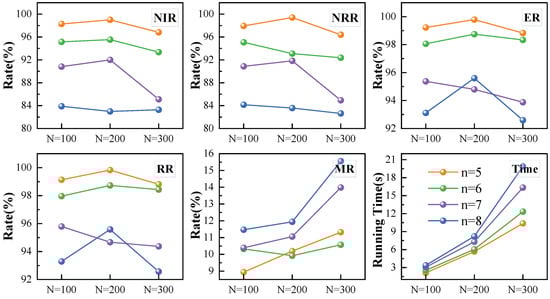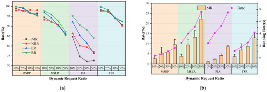 We generate dynamic requests as a fixed proportion of each satellite’s original task volume. As the number of satellites increases, the total number of requests also grows. As the satellite count rises from five to eight, the performance of replanning gradually declines. Specifically, NIR and NRR decrease notably, while ER and RR show smaller declines. This is due to the increased task volume with more satellites, reducing the available space for new insertion. Despite this, overall revenue remains around 92%, demonstrating the adaptability and effectiveness of our method across varying scales.