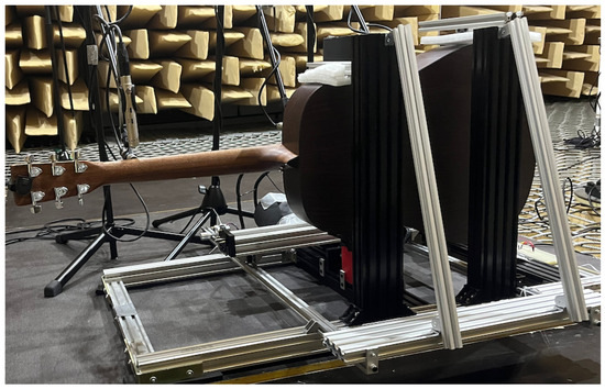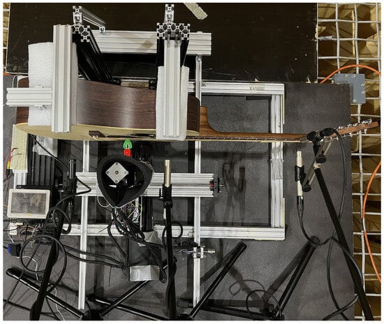 The problem can be solved in several ways. One tactic involves prioritizing repeatability and stability over normal operating conditions. This involves disassembling the instrument, securing its components, and examining each part individually. This makes data collection easier, and it has been a common strategy in previous guitar research, to gain insights into the vibrational properties of guitar top plates, for example, with a free edge and without braces [1], or with fixed ribs but without a back plate [2]. However, this method has its limitations as the vibrational characteristics of the components may differ in a fully assembled instrument, due to varying boundary conditions and the interconnected vibrations of the adjacent parts [3]. A second approach is to study an entire instrument under conditions as close as possible to natural—that is, played by a human and evaluated by a human [4]. This approach, coupled with statistical analysis, can yield reliable information on the audibility of generalized change in the instrument sound timbre, allowing us to determine whether listeners hear the difference between the sound of two instrument specimens, or if they hear the result of introducing some significant change to the instrument. However, collecting more specific data can be challenging, due to the numerous uncontrollable or unquantifiable variables. The third strategy mitigates the human factor by studying the instrument in its entirety, mounted on a fixed stand, and excited mechanically. This allows for the acquisition of more accurate data and research on, for example, the influence on guitar sound characteristics of the stability of selected quantities [5], sound hole geometry [6], or tonewood choice [7], or even of the vibration acceleration spectrum in a cello [8]. This approach can be more precise and repeatable than human playing/evaluation, but, due to the need to fix an entire instrument without affecting its sound, it is less precise than a study of extracted instrument elements. Being able to perform only a single type of simple instrument excitation, the third approach is also less universal than the second approach.