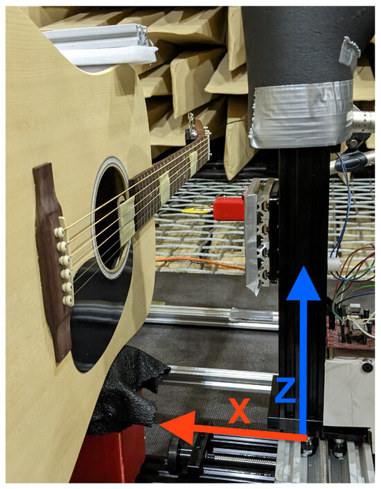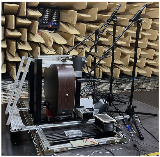 - Tokarczyk, D.; Pluta, M.; Wiciak, J. Mechanical guitar player, a robot for automatic testing of string instrument parameters. In Acoustics, Acoustoelectronics and Electrical Engineering; Wydawnictwa Politechniki Śląskiej: Gliwice, Poland, 2021; pp. 365–386. [Google Scholar]