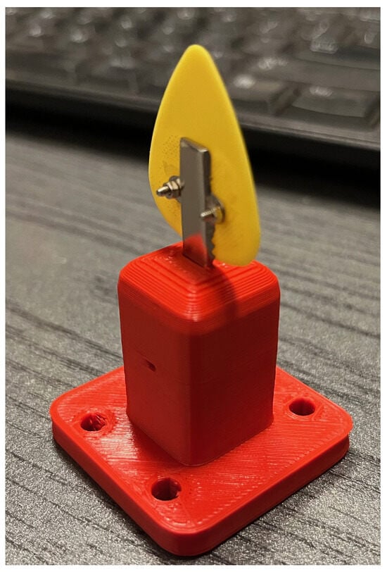 The instrument used for this study was a Martin D-X2e electro-acoustic guitar (C. F. Martin & Company, Nazareth, PA, USA). During the experiment, guitar picks made of different materials (nylon, polycarbonate, steel, felt) were used. All of the picks, including the less popular steel and felt ones, were standard pieces obtained from music stores. They were selected to make possible the study of a wide variety of material properties and geometric parameters. To mount them on the robot, a modified end effector was used, allowing their quick replacement (Figure 5):