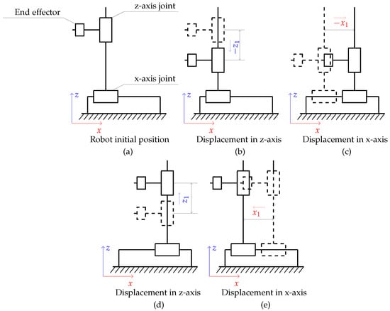 Simplified diagram of the robot movement, with —displacement along the z-axis—and —displacement along the x-axis; (a–e) show the subsequent phases of the movement.