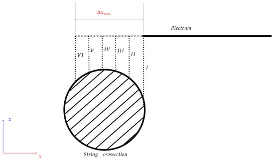 Simplified diagram showing the string-excitation points on string cross-section during the test. Roman numerals I–VI indicate subsequent positions of the plectrum displacement; is the range of TCP movement on the x-axis and was equal to 0.96 mm. The thickness of the tested string was 1.4224 mm.
