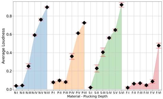 Comparison of average relative loudness values, calculated according to ISO 532-1:2017 §6 [40], with standard deviations for different material and plucking-depth configurations. Capital letters denote plectrum material: N—Nylon, P—Polycarbonate, S—Steel, F—Felt. Roman numerals denote subsequent depths of the plectrum during plucking.