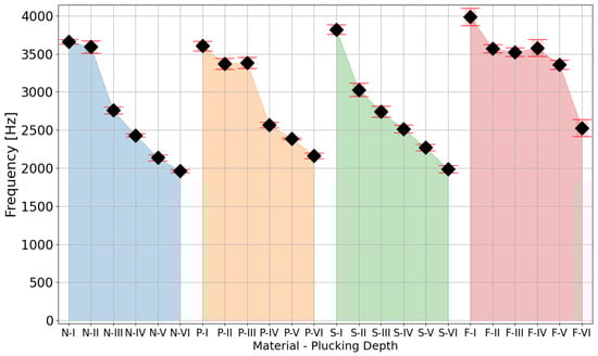 Comparison of spectrum centroid values with standard deviations for different material and plucking-depth configurations. Arabic numbers denote plectrum material: N—Nylon, P—Polycarbonate, S—Steel, F—Felt. Roman numerals denote subsequent depths of the plectrum during plucking.