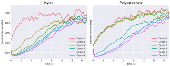 Comparison of spectrum centroid values in time for nylon and polycarbonate plectrums at different plucking-depth configurations.