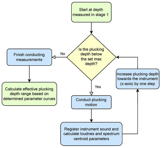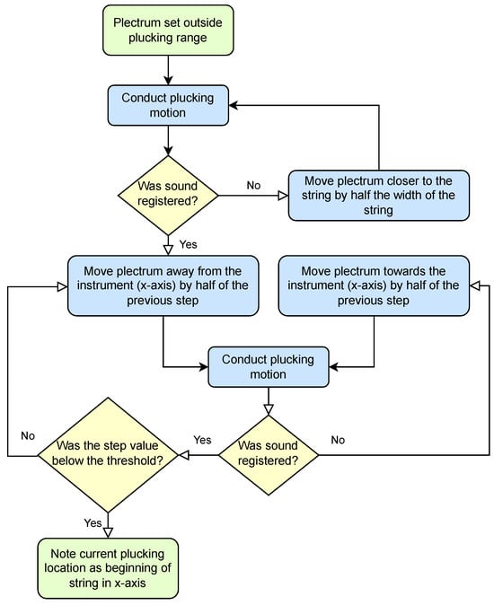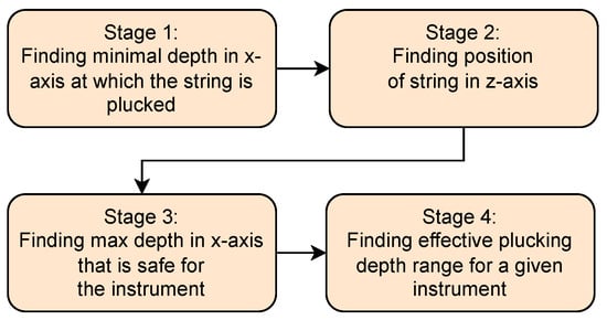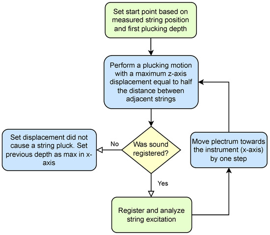 If a string is excited by plucking, the maximum amplitude of the string vibrations depends on the initial displacement. The displacement is obtained by straining a string with a plectrum. Under ideal conditions, when no striking of a string occurs, the amplitude depends only on the point where the string detaches from the plectrum. In this case, the velocity of the plectrum does not play a significant role. Larger displacements are obtained by moving the plectrum towards the instrument and straining the string with increasing area. However, there is a material limit that corresponds to breaking the string, which must be considered when programming robot movements. Therefore, movement along the z-axis is limited to a given known value. The third stage (Figure 16) finds the position of a plectrum on the x-axis, which corresponds to the last safe string displacement. The robot attempts to pluck the string with a pick displacement along the z-axis, set to the maximum safe amplitude. After each pluck, the plectrum is moved towards the instrument. If the plucking movement does not produce sound, this means that the given string displacement required to produce the pluck would exceed the point of maximum safe plucking, and, thus, the end of the plucking range is established.