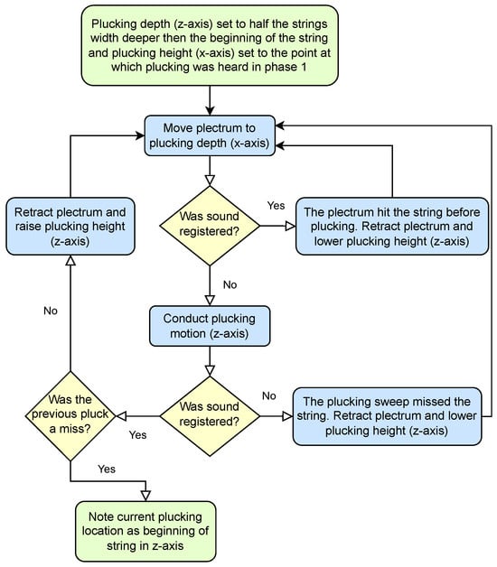 The first stage (Figure 14) sets the plucking element anywhere outside the plucking range, which can be done without any acoustic aid, on the sole basis of limit switches and stepper motors. Then, the plucking element attempts a plucking movement, and the sound sensor observes the result. The movement is repeated with the plucking element shifted towards a string. Once the first pluck has been registered, a halving procedure is applied, to shift the plucking element around the minimum depth at which plucking occurs in decreasing steps, so as to establish its position with the highest precision allowed by the stepper motor.