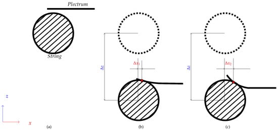 Simplified diagram showing the excitation points of the string on its cross-section, depending on the elasticity of the pick. Subfigure (a) presents the pick before the pluck; (b) presents displacement of the pluck point for a more rigid plectrum; (c) presents displacement of the pluck point for an elastic plectrum; and —displacements of the pluck point in relation to the center of the string; —displacement of the string from its equilibrium position.