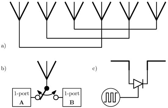 Examples of possible arrangements for passive and semi-passive backscatterers: (a) Van Atta array, (b) variation of antenna termination, (c) switching diode as load.
