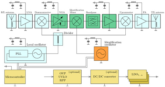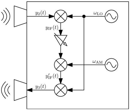 In a first step, the received signal is downconverted to an intermediate frequency . It is then amplitude-modulated with the known envelope frequency , amplified, and finally upconverted again using the same local oscillator frequency .