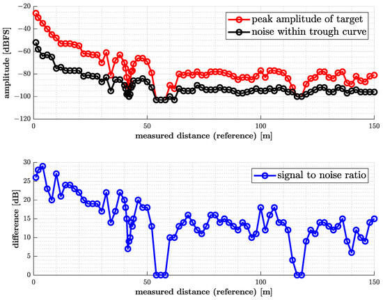 The drop in signal amplitude at certain ranges should be addressed as well. The second undetectable range is at about twice the distance of the first, so that a periodic behavior could be present. The next interval would be outside the selected measurement window. A likely explanation would be multipath propagation, which leads to destructive interference at certain distances. To confirm this, it would be conceivable to conduct another series of measurements in a different environment.