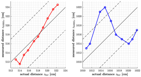 In order to examine the system’s precision at small distance changes, the position of the responder unit was slightly varied in steps of approximately 1 cm. This was carried out in the setup of the first experiment, at distances of about 5 m and 10 m between the radar and the responder. The result is given in Figure 12, which indicates that the tolerance limits specified by the system requirements are exceeded in the test at 10 m.