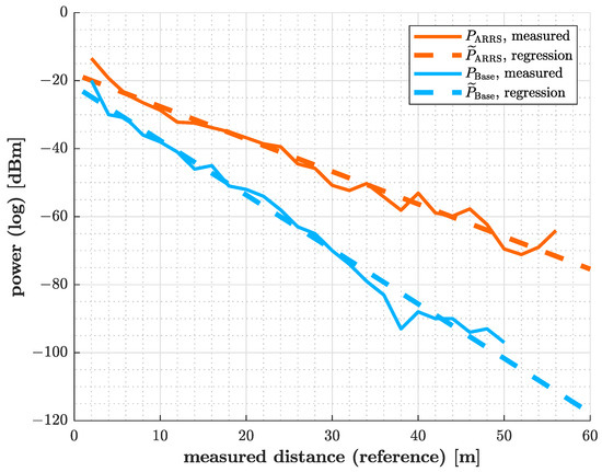 For the free-space test results, the measured carrier power values as well as distance-dependent power values determined at the base station were subjected to regression analysis. Since the power values were given on a logarithmic scale, the corresponding distance values were also logarithmized to base 10. In this double-logarithmic representation, the result was a straight line whose slope corresponded to the power of the distance. Thus, linear regression could be applied: