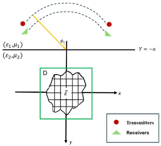 Assume a uniaxial object  is buried in a lossy half-space, as shown in Figure 2.  and  represent the dielectric constants of Region 1 and Region 2, respectively. Similarly,  and  signify the conductivity of Region 1 and Region 2, respectively. Let  be the permeability of free space in each region. In other words, this article focuses exclusively on scatterers as nonmagnetic materials. We begin by introducing a dielectric object in which the scatterer is infinitely extended along the z-axis. Specifically, we consider an incident wave with TM polarization. We define the relationship between the incident wave and its time variation as , and we denote its angle of incidence as .
