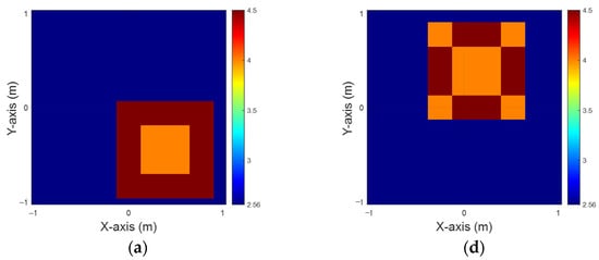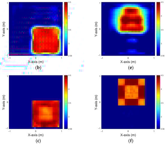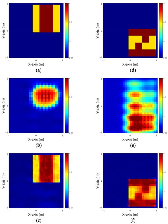 Figure 5a,d show the ground truth configurations for  and , respectively. Figure 5b,e display the reconstruction results obtained using the BPS method, while Figure 5c,f present the DCS reconstruction outcomes for the  and  cases, respectively. The results reveal that the presence of an object buried in a half-space medium causes significant scattering of incident waves, adversely affecting reconstruction accuracy. In addition, the nonlinearity increases proportionally with the dielectric constant of the embedded object, posing significant challenges to reconstructing accurate electromagnetic images. Likewise in case A, despite utilizing two distinct input configurations and a well-trained CNN, the BPS method is limited to approximating the object’s location. In contrast, the DCS method demonstrates superior performance, providing more accurate estimates of both the position and distribution of buried materials. Table 2 summarizes the RMSE and SSIM metrics for this scenario.