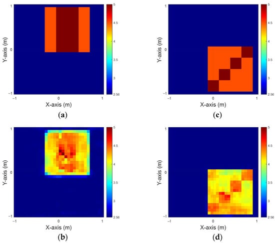 Relative permittivity between 4.5 and 5 using Section 4.2 model. (a) ground truth for  (b) ground truth for  (c) DCS reconstruction outcome for  (d) DCS reconstruction outcome for .