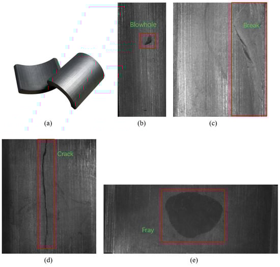 Magnet tile image and images of four types of magnet tile defects: (a) normal magnetic tiles, (b) blowhole defect: Subsurface or surface cavities formed by gas entrapment during the casting process, (c) break defect: Complete through-thickness fracture in magnet tiles, typically characterized by penetrating discontinuity, (d) crack defect: Linear fissures manifesting on or beneath the material surface, and (e) fray defect: Surface delamination or fibrous surface morphology observed in magnet tiles.