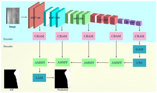 The architecture diagram of AMSFF-Net. In this study, VGG-16 is used as a feature extractor to generate feature maps at five different levels, which are processed by the CBAM attention mechanism. AMSFF represents the adaptive multi-scale feature fusion module, GAM denotes the Global Attention Module, CPA module is a Cascaded Pyramid Attention module, and LAM represents the Local Attention Module.