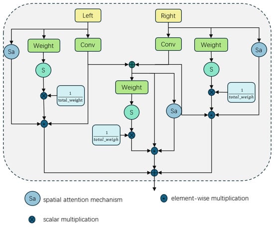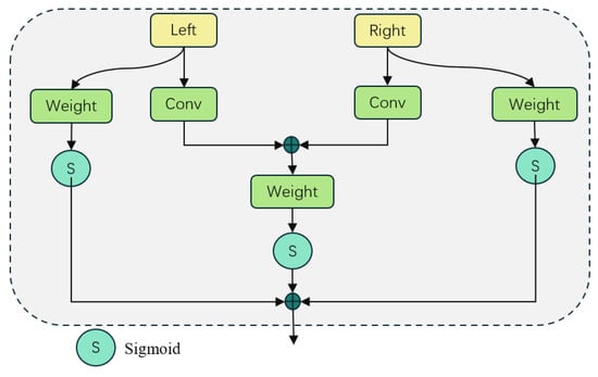 As shown in Figure 3, for each feature map (left, right, and combined), we calculated their respective weights and then summed them to obtain the total weight. This process employs the Sigmoid activation function [] because it smoothly limits the output weights, making the weight distribution more reasonable and avoiding the interference of extreme values.
