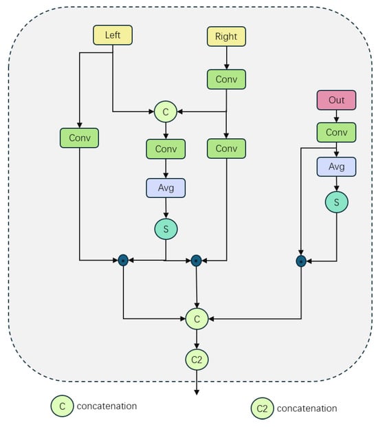 Firstly, the left channel feature L and right channel feature R were concatenated along the channel dimension to obtain Concat(L,R). Subsequently, this concatenated result was input into the convolutional layer Conv_cat for processing, resulting in a new feature map out1. This operation aimed at fusing features from both channels to fully leverage this information during subsequent processing steps. The expression can be represented by Equation (8).