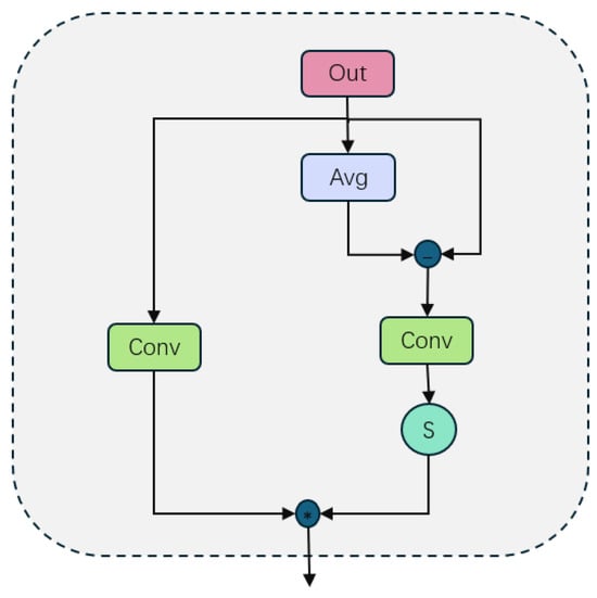 The fused feature map underwent a global average pooling operation, which aided in extracting an overall feature representation. The output of this pooling operation was then processed through a convolutional layer with a Sigmoid activation function. This layer played a crucial role in computing adaptive weights for each feature map (expressed as Equation (9)). By utilizing the Sigmoid function, we ensured that these weights fell within the range of 0 to 1, thereby achieving smoother weight distribution and mitigating any negative effects caused by mutations in weight on model performance.