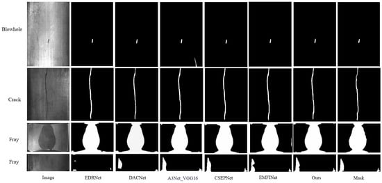 (2) Experimental Setup: The hardware configuration for this study included an NVIDIA 4070 GPU with 8 GB of memory (Santa Clara, CA, USA), utilizing the PyTorch 1.13.0 framework []. During model training, each tile defect image was resized to 256 × 256 with three channels. Data augmentation techniques such as random horizontal flipping and random rotation were employed to mitigate the risk of overfitting. These augmentations also expanded the training dataset, providing a more diverse set of samples. Momentum Stochastic Gradient Descent (SGD) [] was used to ensure the stability and convergence of the training process. The initial learning rate was set to 0.0015, combined with a polynomial decay strategy with a decay factor of 0.9, which helped gradually decrease the learning rate during training to achieve optimized results. The entire training process comprised 150 epochs to ensure the sufficient learning and optimization of the model parameters. Based on experimental considerations and hardware resources, the batch size was set to 8 to balance training efficiency and model performance. These settings allowed the network model to achieve good training results while maintaining efficiency. The specific neural network parameter settings are shown in Table 1.