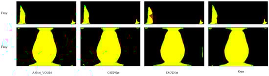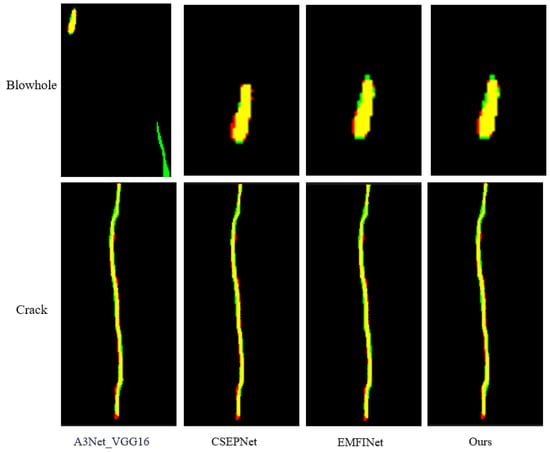 (3) This paper compared the proposed method with existing advanced SDI-SOD methods, including EDRNet [], DACNet [], EMFINet [], CSEPNet [], and two different architectures of A3Net [] (A3Net_VGG16 and A3Net_Res2Net50). To ensure a fair comparison, all saliency maps were generated using open-source code with standard parameter configurations. A meticulous comparison procedure was designed in this study to ensure the reliability and validity of the evaluation results. Figure 7 shows a comparison of saliency maps generated by AMSFF-Net and other advanced methods. Additionally, Figure 8 and Figure 9 provide a detailed comparison between our method and the top three advanced methods. We overlay the saliency maps generated by these four methods with the ground truth images for comparison. The defects in the ground truth are highlighted in red, the generated saliency maps are shown in green, and the overlapping regions are displayed in yellow. The red and green portions in Figure 8 and Figure 9 represent the differences between the two overlapping images. From Figure 8, it can be observed that the performance of our method, based on the A3Net_VGG16 network, is comparable to that of the EMFINet and CSEPNet networks. However, as shown in Figure 9, our method outperforms both EMFINet and CSEPNet.