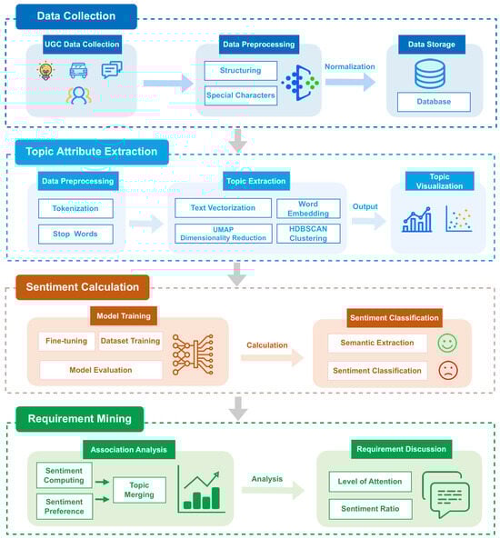 This study presents an analysis method that combines the BERTopic and RoBERTa models using UGC data, aimed at deeply exploring and analyzing the multi-dimensional characteristics of user requirements for automobiles. This method enables us to effectively identify and summarize key topic attributes that users care about, thereby precisely refining their specific needs. The technical framework is illustrated in Figure 1, which outlines the complete process from data collection to requirement analysis.
