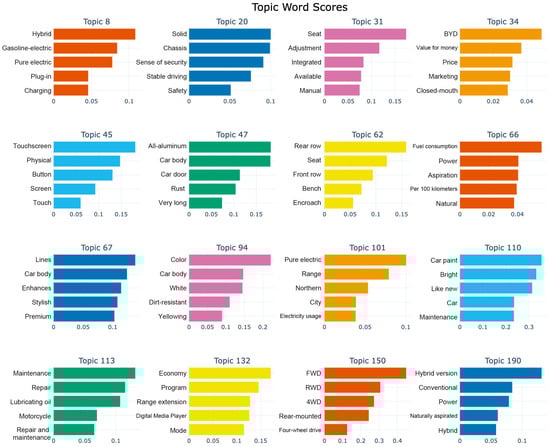 Figure 2 illustrates some of the themes identified by the model along with their keywords, visually reflecting the frequency distribution of keywords within each theme, thereby facilitating the rapid identification of important terms in specific topics. Each set of bars in the same color represents a group of related themes and their associated keywords. The horizontal axis indicates the score of each term within the specific theme; a higher score suggests a stronger relevance of the term to that theme. The vertical axis lists the various keywords across different themes. These identified themes reflect the main points of interest for users when discussing automobiles, covering various aspects. For example, Topic 8 focuses on vocabulary related to the powertrain, such as “hybrid”, “petrol-electric”, and “pure electric”, indicating users’ interest in different power types. Topic 20 addresses automotive safety and comfort, with keywords like “seats”, “adjustment”, and “safety”, highlighting users’ emphasis on the riding experience and safety assurance. Other themes follow this pattern.