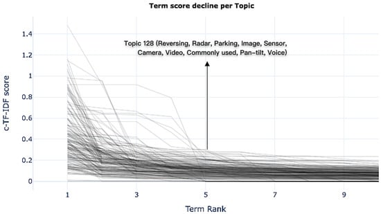 Figure 3 shows the terms with the highest c-TF-IDF scores in each theme and their importance, revealing the core keywords of the themes. The horizontal axis ranks the terms within a specific theme, while the vertical axis represents the probability scores of those terms within the theme. The curve illustrates how the importance of the terms declines as their rank increases. For instance, in Topic 128, the top keywords include “reversing”, “radar”, “parking”, “image”, “sensor”, “camera”, “video”, “common”, “gimbal”, and “voice”, collectively reflecting user interest in reversing assistance and related intelligent technologies. The c-TF-IDF scores of the top five to seven keywords are relatively higher than those of other words, demonstrating their key significance within the theme. Therefore, these high-frequency terms not only aid in quickly identifying the core content of the themes but also further reinforce the user’s focus on specific needs. Based on this analysis, subsequent theme interpretations will prioritize the top seven high-frequency keywords to gain deeper insights into users’ actual needs.