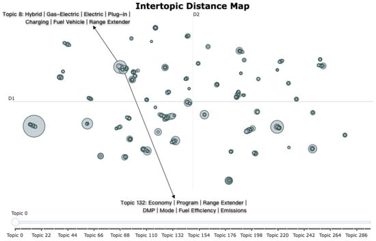Figure 4 visualizes the similarities and relationships between themes, displaying the positions of various themes and their semantic structures in a two-dimensional space. Each circle represents a theme, with the distance between circles reflecting the semantic similarity of the themes, while the size of the circles may suggest different categories of themes. Circles that are close together indicate a high degree of relevance in content, reflecting overlaps in keywords and discussion topics. For example, Topic 8 includes keywords such as “hybrid”, “petrol-electric”, “pure electric”, “plug-in”, and “charging”, which primarily revolve around the driving methods and power types of new energy vehicles, indicating users’ concerns about multiple power choices. Its neighboring topic, Topic 132, encompasses keywords like “economy”, “extended range”, “fuel-efficient”, and “emissions”, focusing on the economic, environmental, and energy efficiency aspects of new energy vehicles. The content discussed in both themes is highly correlated, aligning with user interests in the performance of new energy vehicle technologies and their practical usage costs.