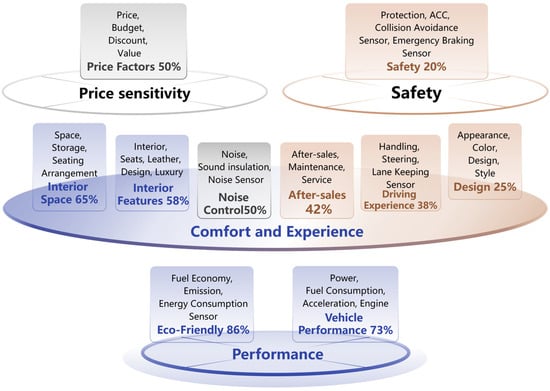 Through the sentiment–theme association analysis of automotive users’ UGC data, we categorized user needs into four types: performance, comfort and experience, safety, and price sensitivity, as shown in Figure 5.