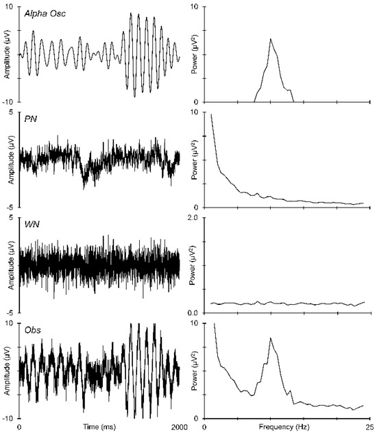 However, the EEG frequency spectrum contains not only oscillations but non-oscillations—voltage fluctuations that are not rhythmical or repetitive. Although these are commonly considered as nuisance noise, some better-defined non-oscillations have been increasingly considered for their possible functional roles in brain dynamics. Chief amongst these non-oscillations was described by Johnson [20] in his studies of vacuum-tube Schottky noise. This non-random noise, with power proportional to the inverse of the frequency (i.e., 1/f), is now termed “pink” noise (PN). Another well-defined non-oscillation found in the EEG is “white” noise (WN), which has a uniform power distribution over frequency [21]. Figure 1 illustrates how PN and WN can add to alpha oscillations in the time domain (left panel) and contribute to the observed frequency spectrum (right panel).