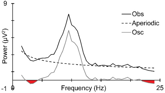 Efforts have been made to estimate PN in the EEG, but these have not been without issues. For example, the most widely used extraction method, specparam [22], extracts a near-pink noise (i.e., the extracted noise power only approximates a 1/f distribution) that is now labelled “aperiodic” noise. This often contains more power at some frequencies than the observed spectrum [21]. Consequently, if this is subtracted from the observed power, there is an under-estimate of the oscillation power, producing instances of negative power (which is physically impossible). These problems are illustrated in Figure 2, in which a genuine observed EEG spectrum (Obs) from a participant in the present study was decomposed using specparam to obtain the aperiodic noise. The negative power estimates in the derived oscillation (Osc) are indicated in red.