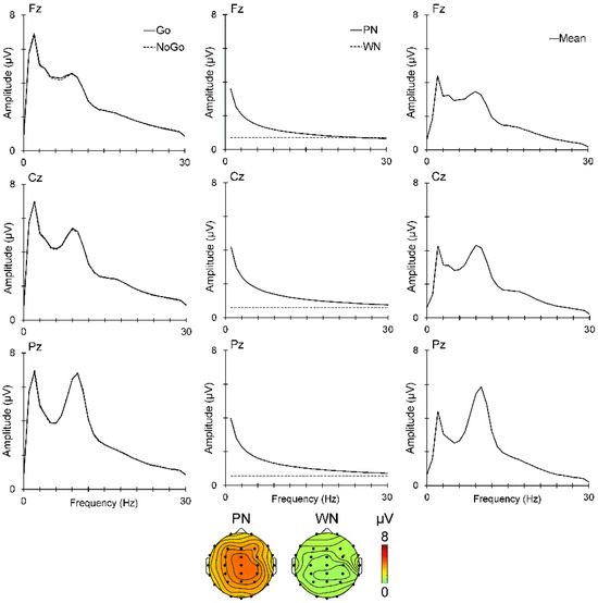 The EEG amplitude spectra at the midline sites are shown in Figure 3, with the raw data on the left, PN and WN in the centre, and noise-free oscillations on the right. The raw spectra for both Go and No-Go are overlaid, but are barely distinguishable, confirming our expectations and supporting their averaging for input into PaWNextra and subsequent processing.