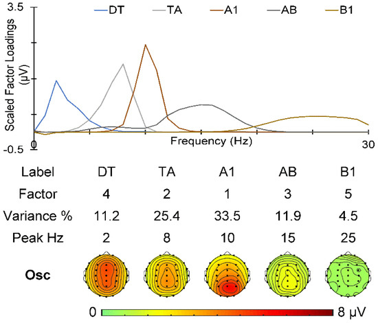 The spectra for PN and WN appear as expected, and their topographies at 1 Hz are shown at the bottom of Figure 3. PN shows a vertex distribution, while WN is reduced in magnitude and more diffuse, comparable with [21]. The Go/No-Go prestimulus spectrum after removal of PN and WN was submitted to f-PCA with Promax rotation and yielded five oscillation components carrying more than 1.5% of the variance each, for a total of 86.5% variance. The scaled factor loadings and their topographic distributions are shown in Figure 4. There was one delta/theta (DT) component peaking at 2 Hz, one theta/alpha (TA) component peaking at 8 Hz, an alpha (A1) component with a 10 Hz peak, an alpha/beta (AB) component peaking at 15 Hz, and a beta component (B1) peaking at 25 Hz. The topographies shown are similar to those previously published [15,16,17,18,19,20] and support the present band labels.