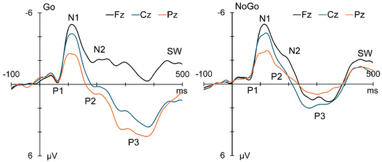 Morphology of the mean ERPs at the midline sites. Left: Go ERPs; note large parietal P3. Right: Corresponding No-Go ERPs; note reduced P3 dominant at Cz.