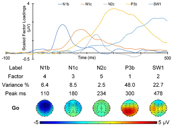The t-PCA of the Go ERPs identified five components carrying more than 1.5% of the variance each, for a total of 88.1% variance. Their scaled factor loadings and topographies are shown in Figure 6. Go components N1b, N1c, N2c, P3b, and SW1, in temporal order, were identified by their characteristic latency and topography [2,4,7,29,30].